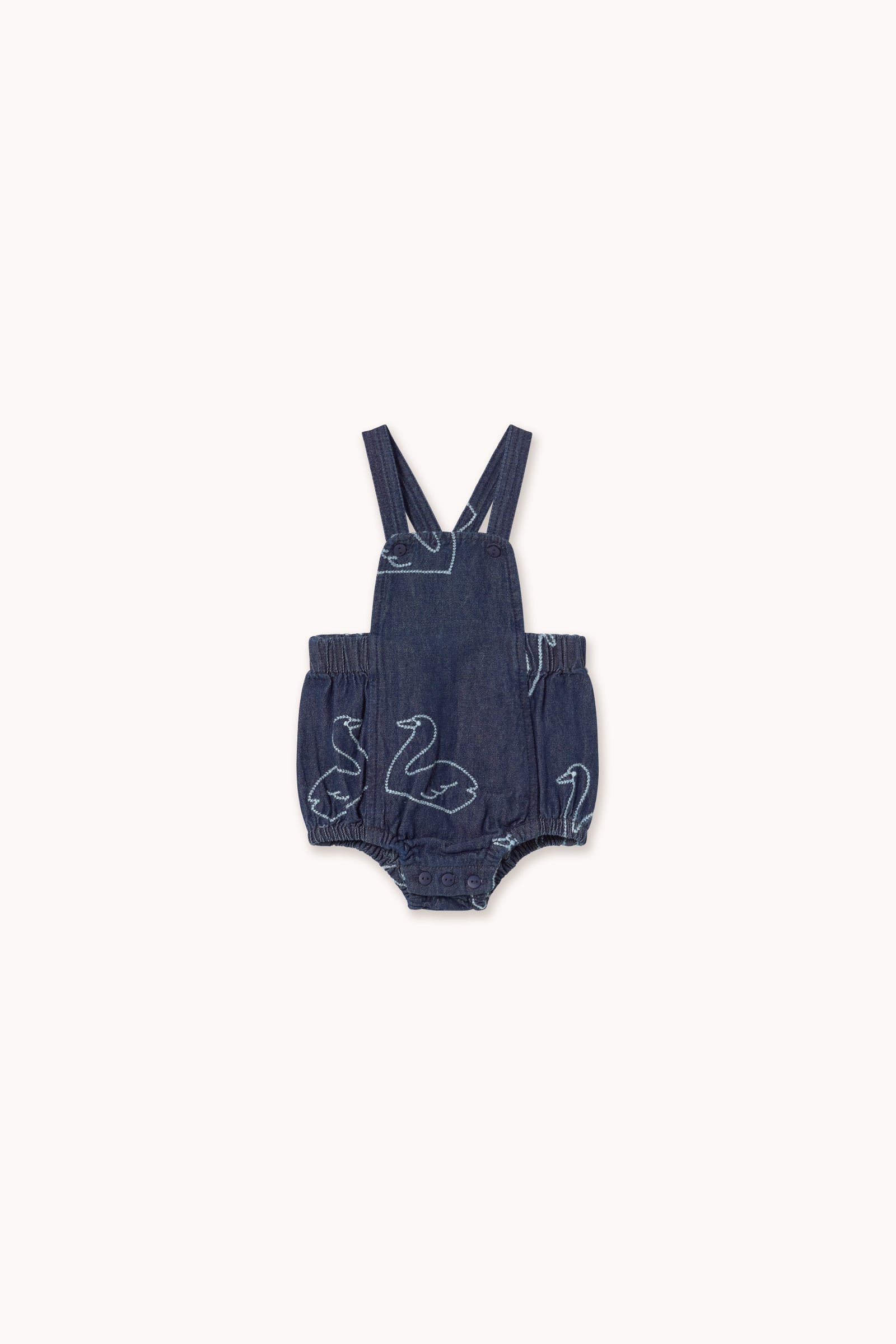 This baby bodysuit with a Big Swans print combines comfort and functionality in an adorable design. It features cross-back adjustable straps with buttons, a gathered elastic waistband, and a snap-button bottom for easy diaper changes. Perfect for playtime and rest with complete comfort.
