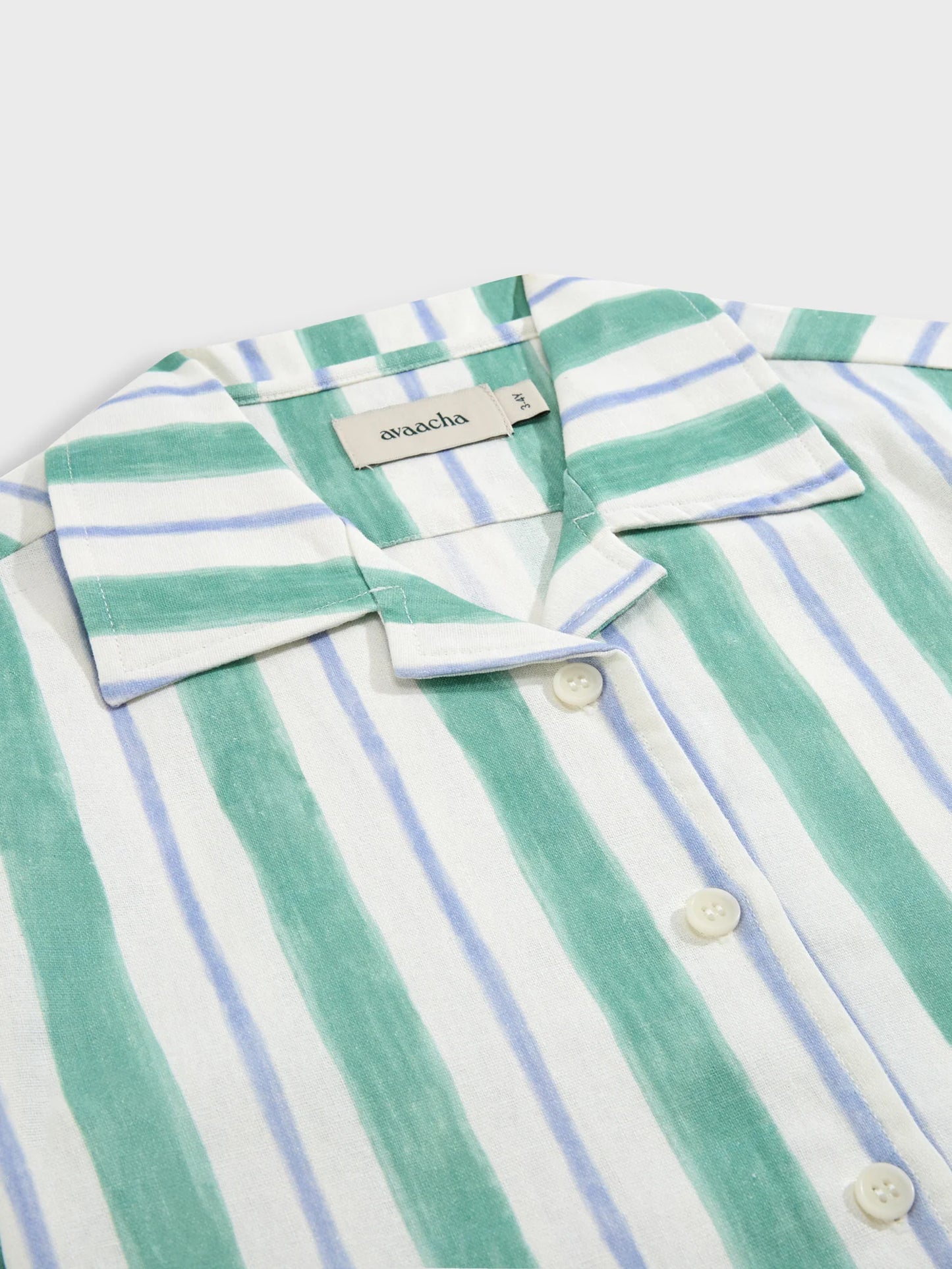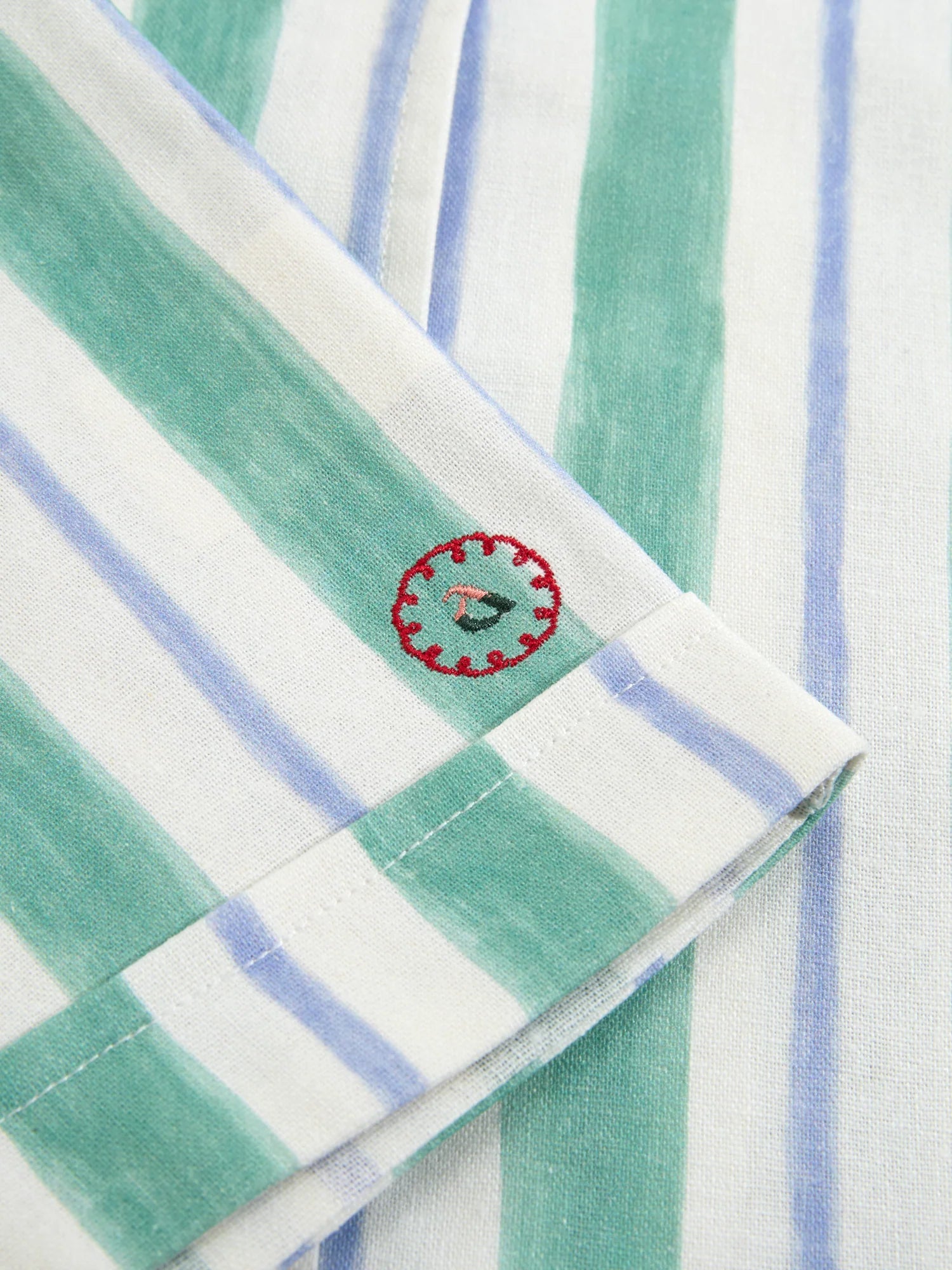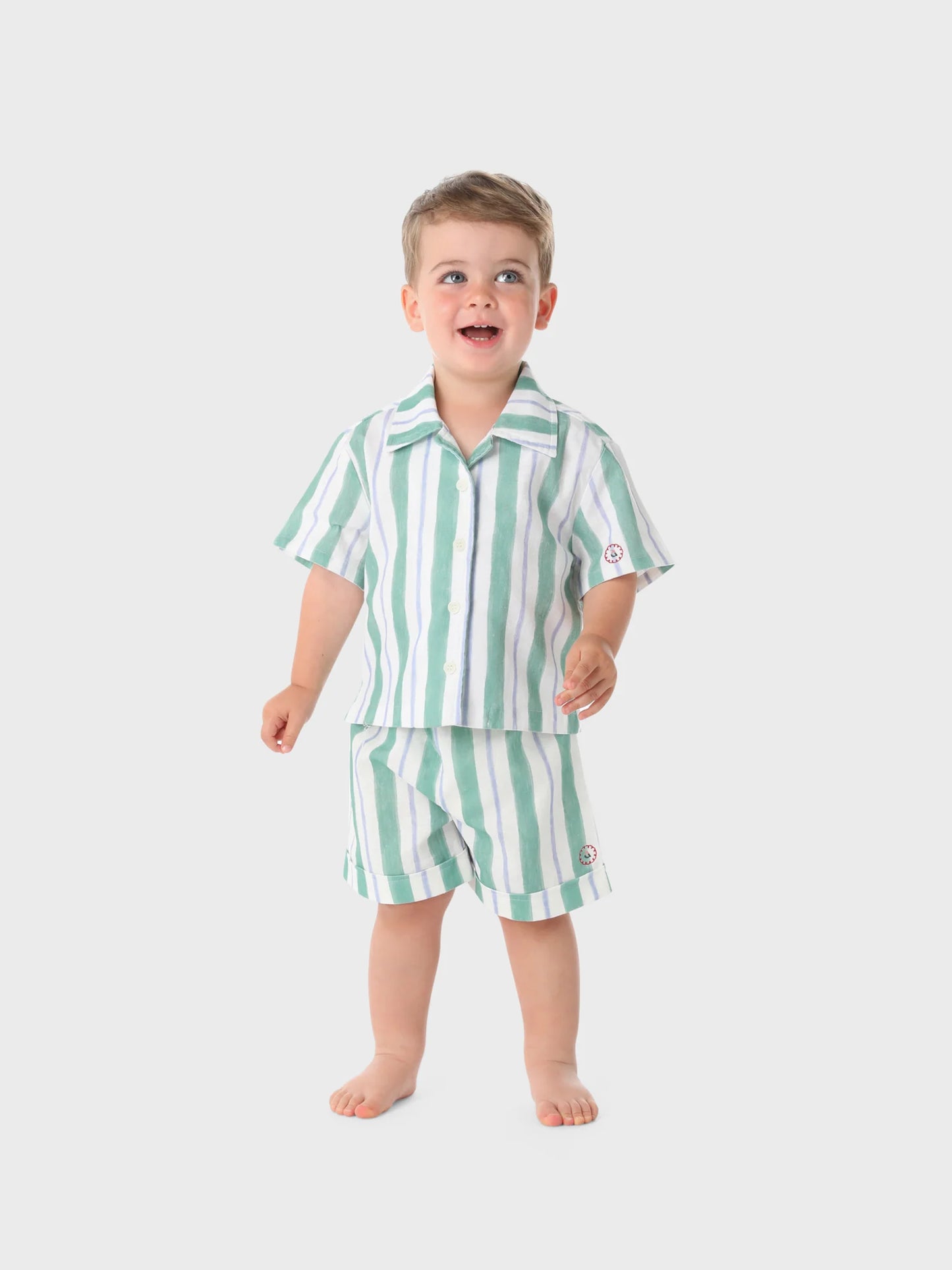 A shirt and shorts co-ord set in our exclusive Horizon print, made from a luxurious, breathable cotton-linen blend. The short-sleeved button-down shirt features a classic camp collar, while the shorts have an elasticated waistband and elegantly folded hems. For comfort, the set has a relaxed fit. The embroidered logo on the sleeve cuff and shorts edge add charm to the outfit, which is perfect for spring or summer occasions. Thoughtfully designed in the UAE.