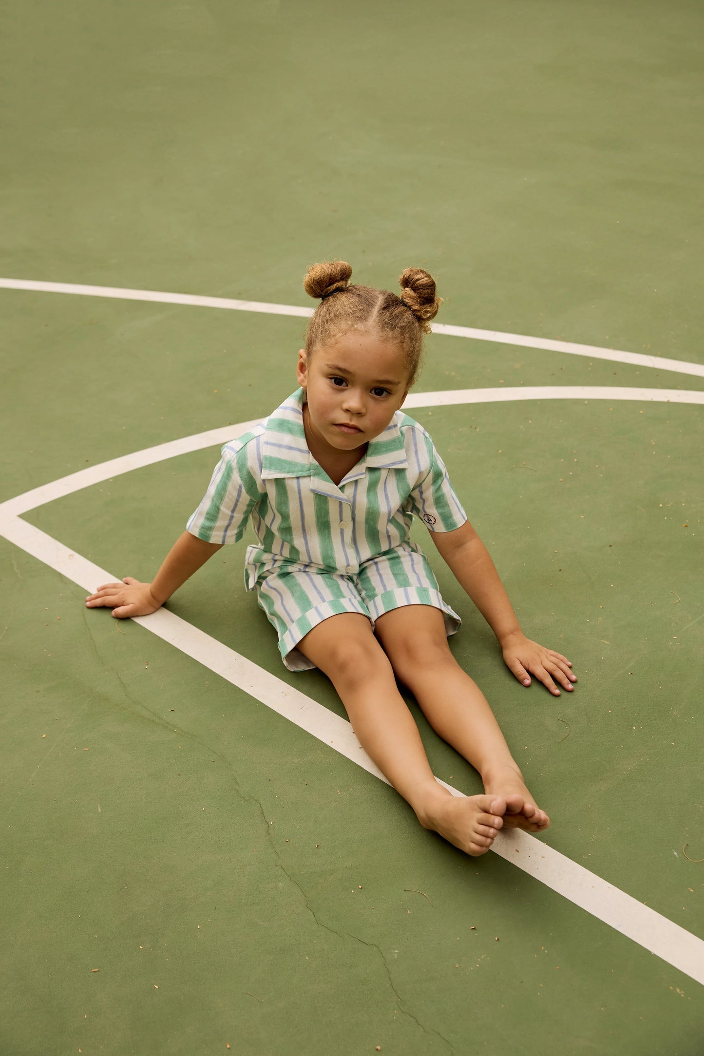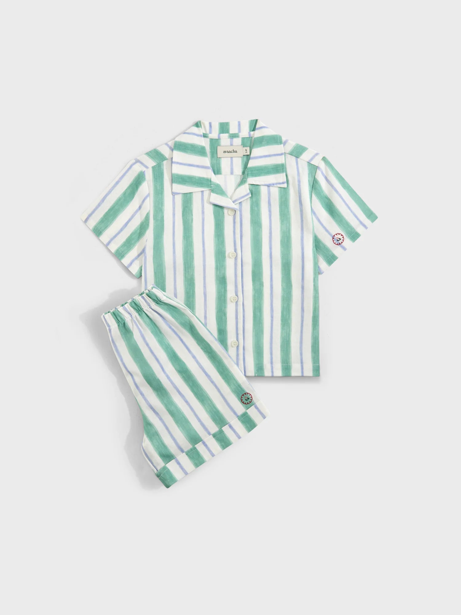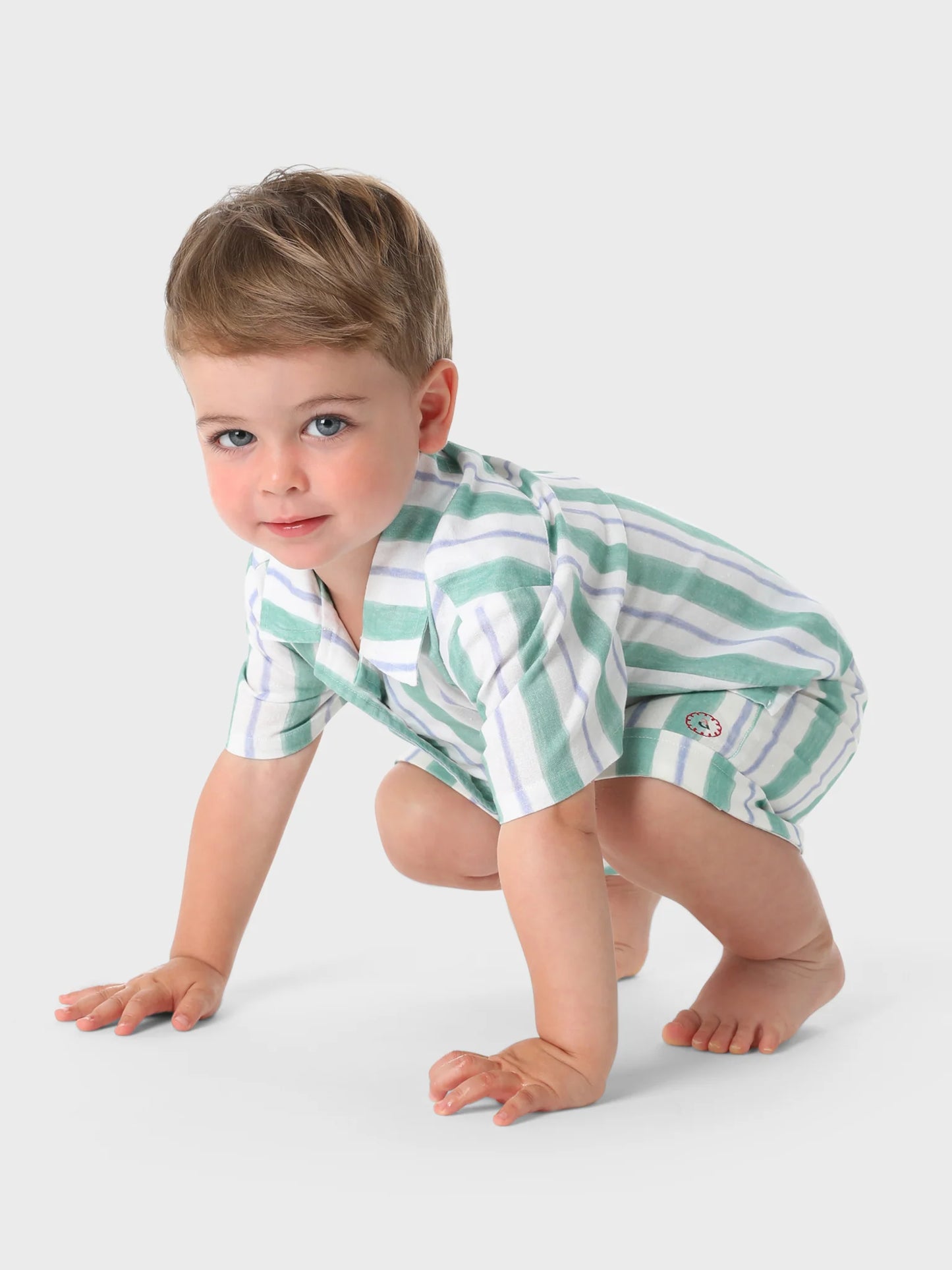 A shirt and shorts co-ord set in our exclusive Horizon print, made from a luxurious, breathable cotton-linen blend. The short-sleeved button-down shirt features a classic camp collar, while the shorts have an elasticated waistband and elegantly folded hems. For comfort, the set has a relaxed fit. The embroidered logo on the sleeve cuff and shorts edge add charm to the outfit, which is perfect for spring or summer occasions. Thoughtfully designed in the UAE.