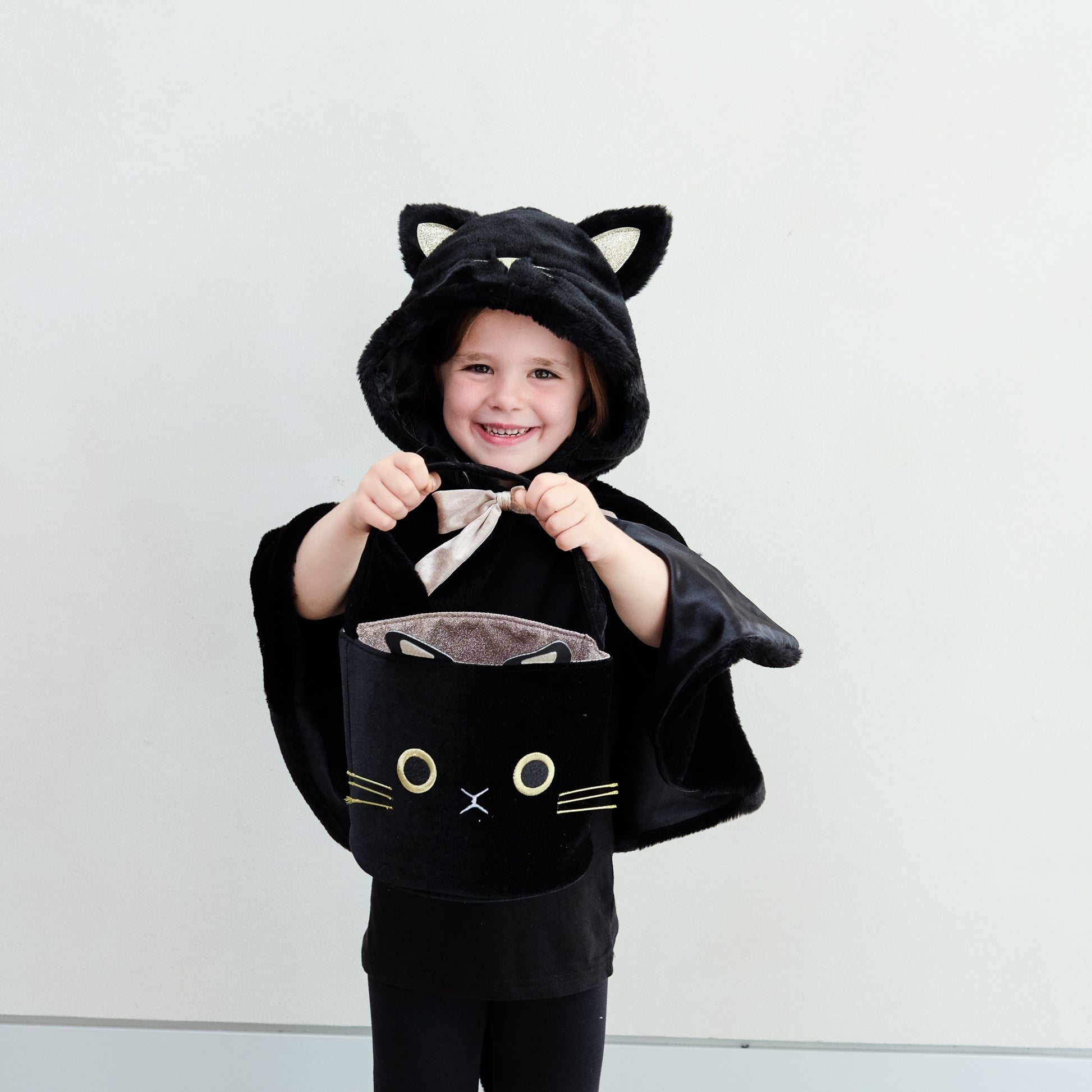 Pounce into playtime with our beautiful new Black cat cape! Crafted from super soft faux fur complete with hood and gold glitter ears - purrrfect for an oh-so-cute Halloween costume or everyday dress-up for little feline fans!