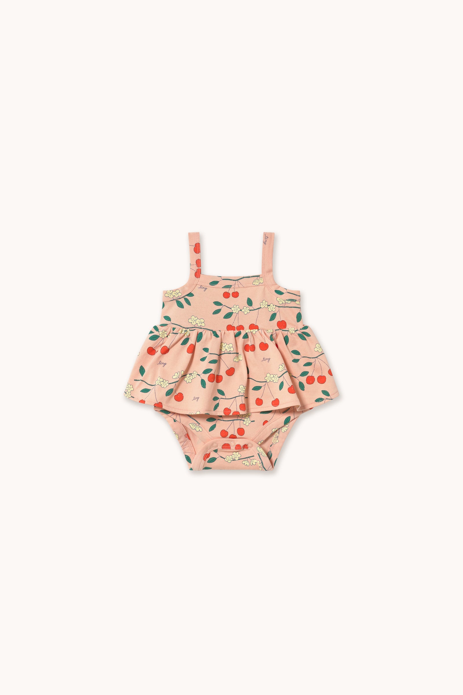 Crafted from 100% organic cotton, this Cherry Trees print body combines comfort, style, and sustainability. It features a comfy, relaxed silhouette with wide shoulder straps and a snaps buttons opening on the bottom.