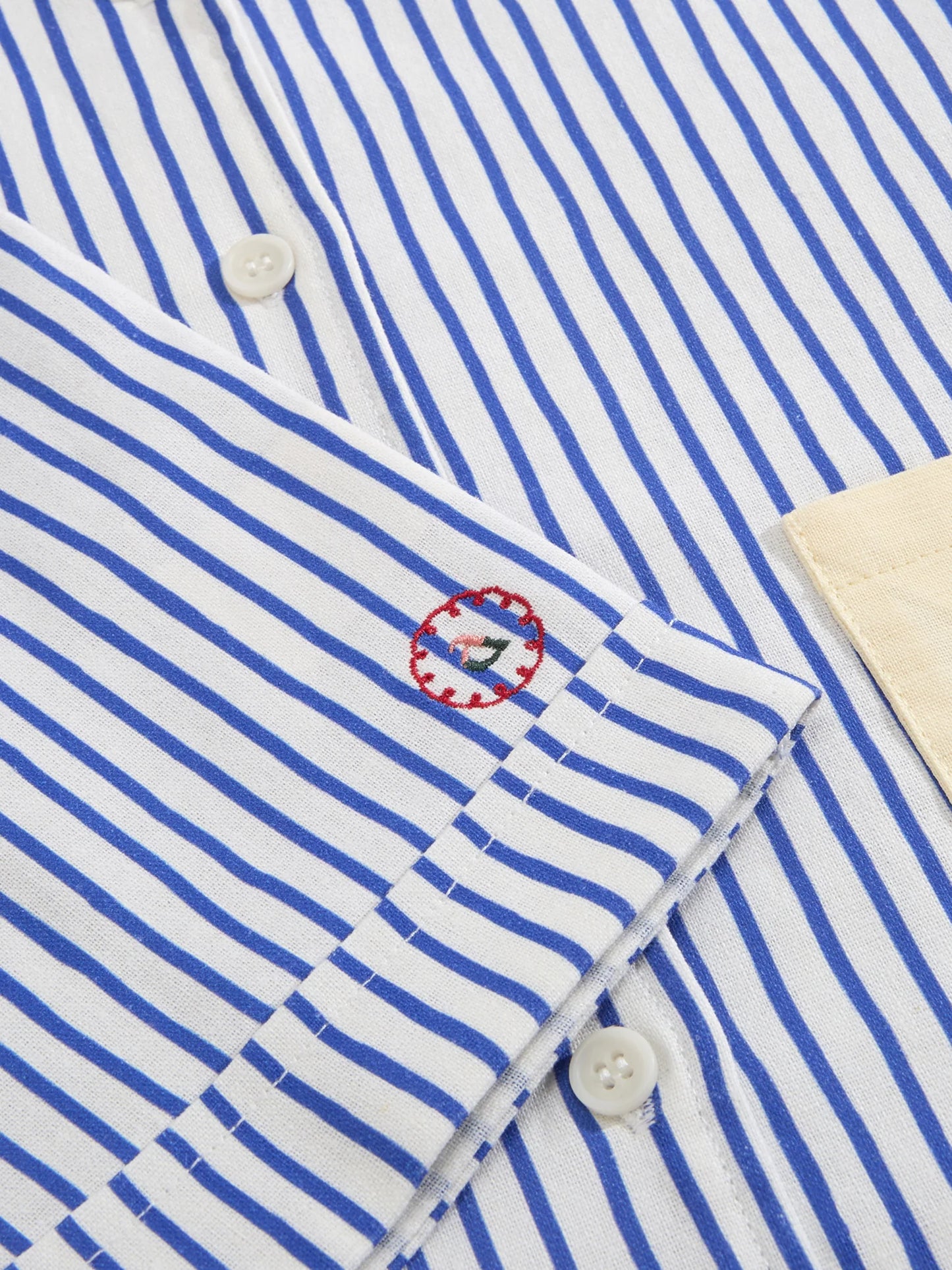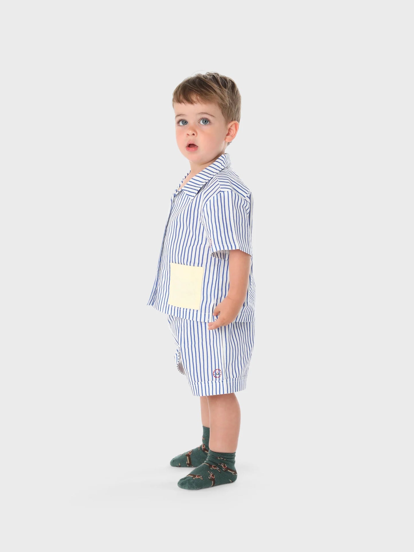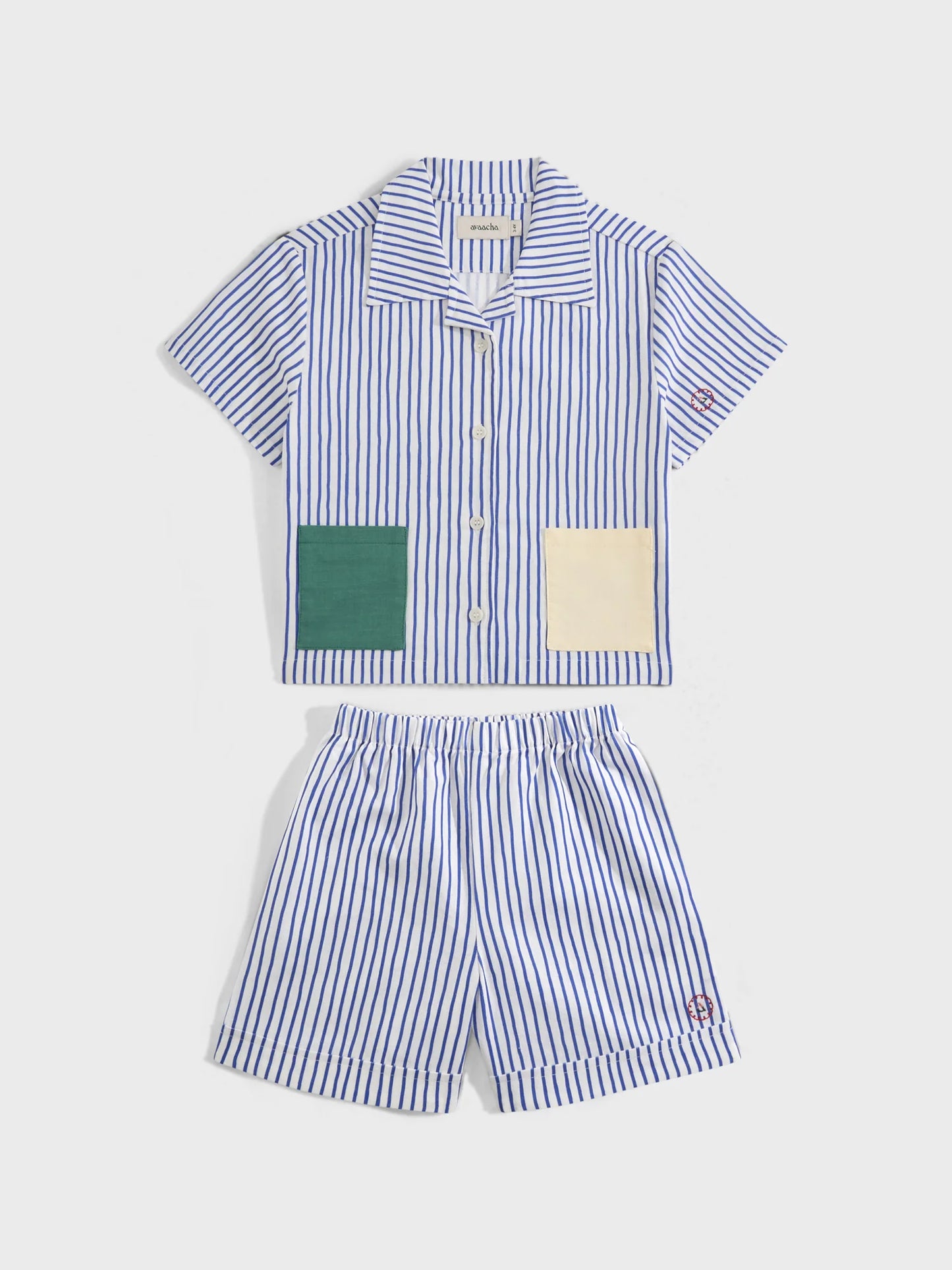 A doodle striped shirt and shorts co-ord set made from a luxurious, breathable cotton-linen blend. The short-sleeved button-down shirt features mismatched pockets and a classic camp collar, while the shorts have an elasticated waistband and elegantly folded hems. For comfort, the set has a relaxed fit. The embroidered logo on the sleeve cuff and shorts edge add charm to the outfit, which is perfect for spring or summer occasions. Thoughtfully designed in the UAE.