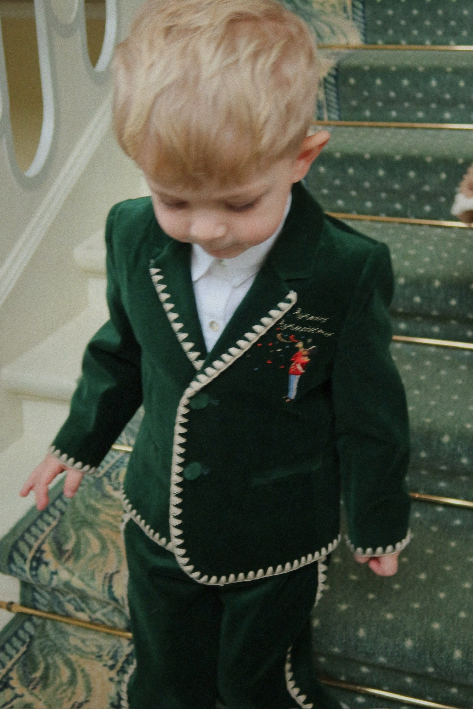 Soft velvet suit pants with classic detailing and white contrast stitching along the sides.