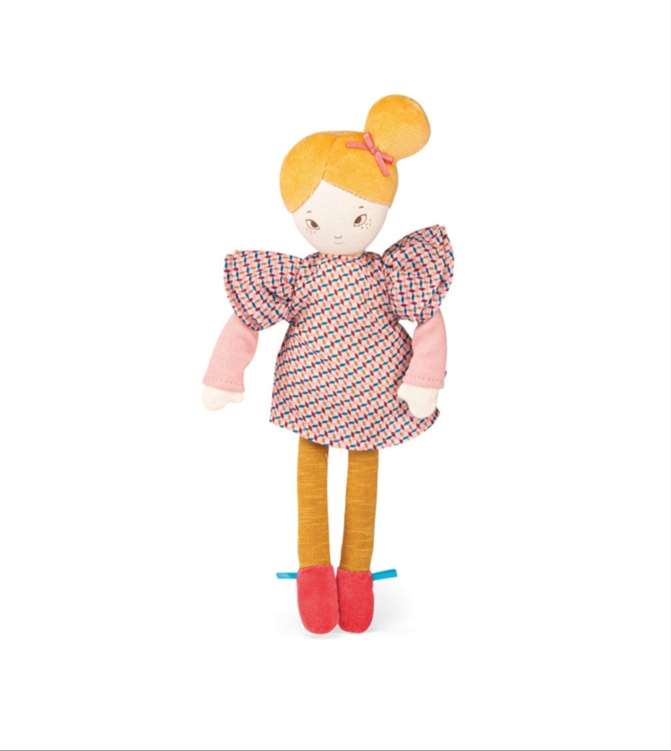 Mademoiselle Agathe is a refined, couture-inspired little doll who loves to stroll through Paris. She wear her pink butterfly-sleeved dress dotted with delicate patterns, worn over mustard jersey leggings and styled in a bun.